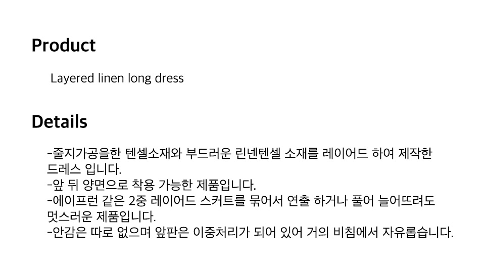 본 제품에 표시되어 있는 섬유 혼용률, 치수, 세탁 방법을 착용 전에 반드시 확인하기 바랍니다.