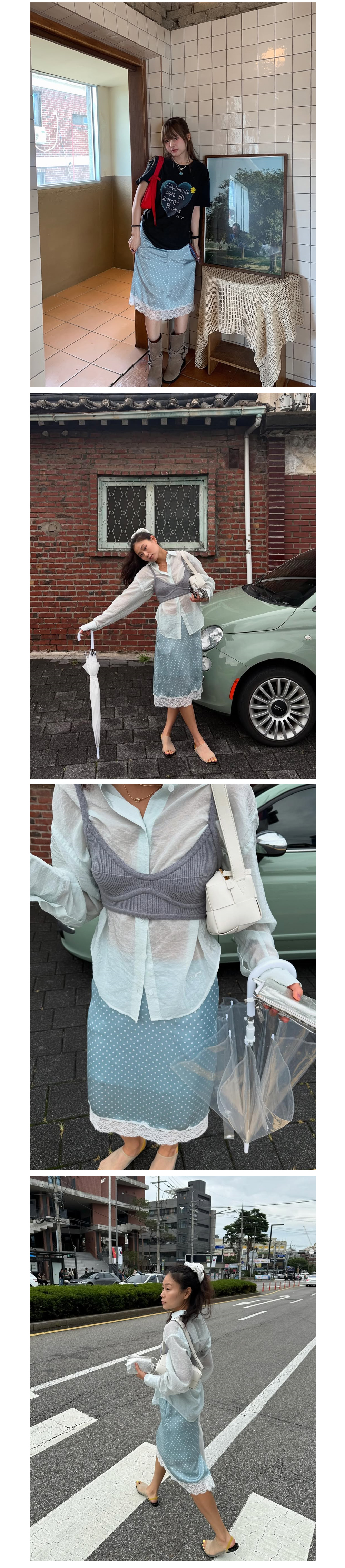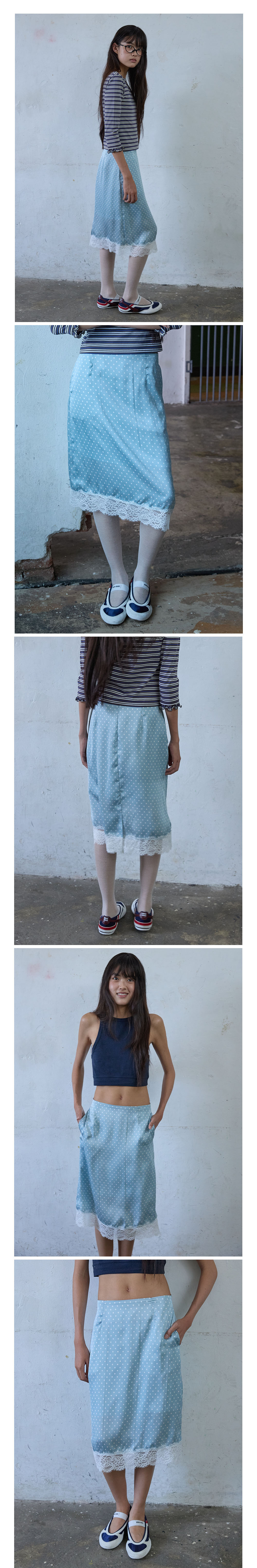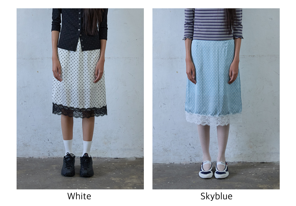 - 은은한 도트 패턴과 레이스 디테일이 조화를 이루는 스커트입니다.