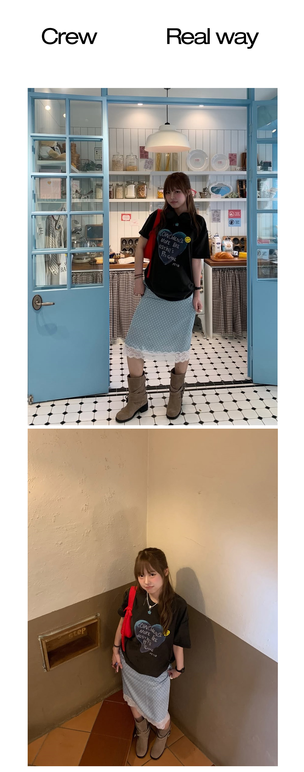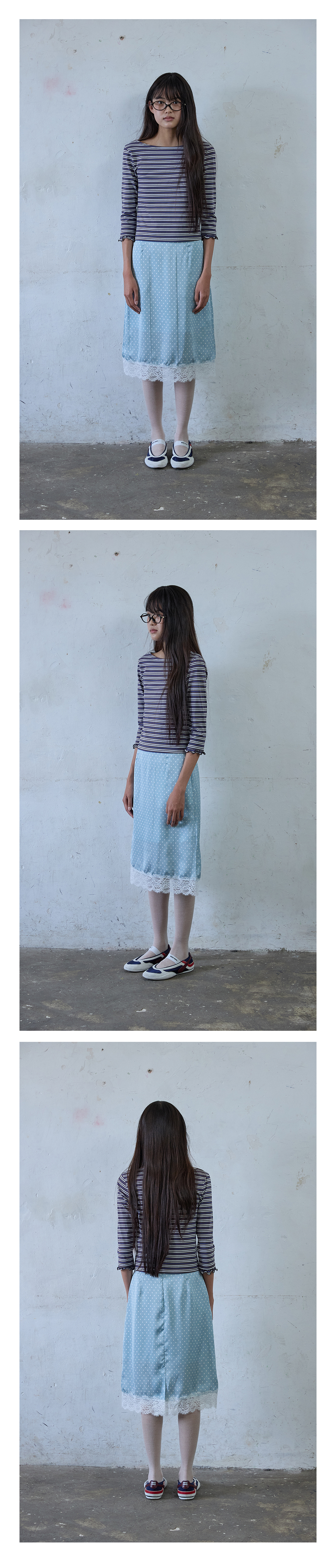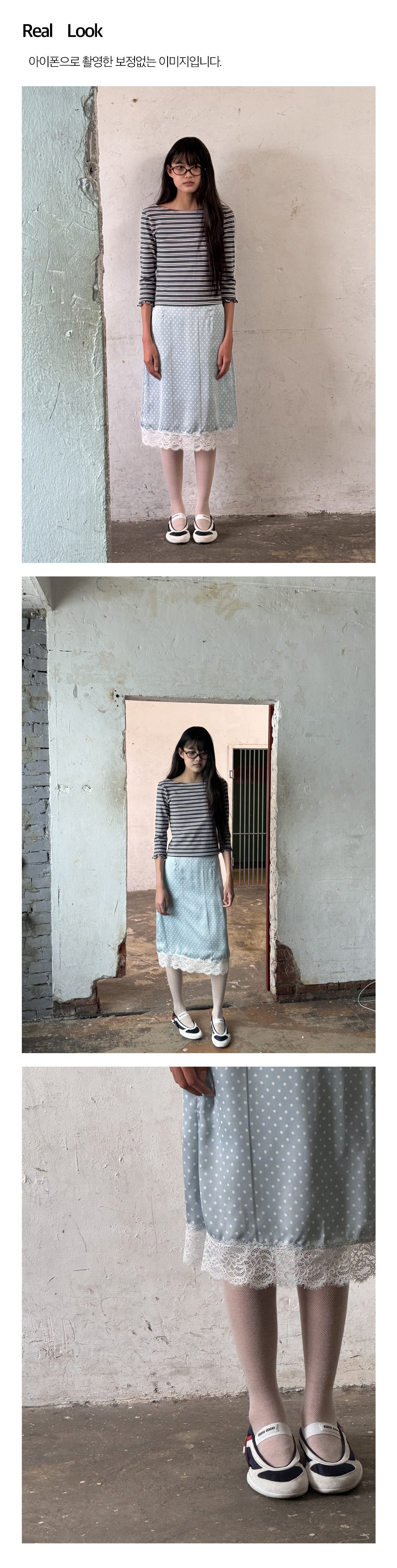 - 은은한 도트 패턴과 레이스 디테일이 조화를 이루는 스커트입니다.