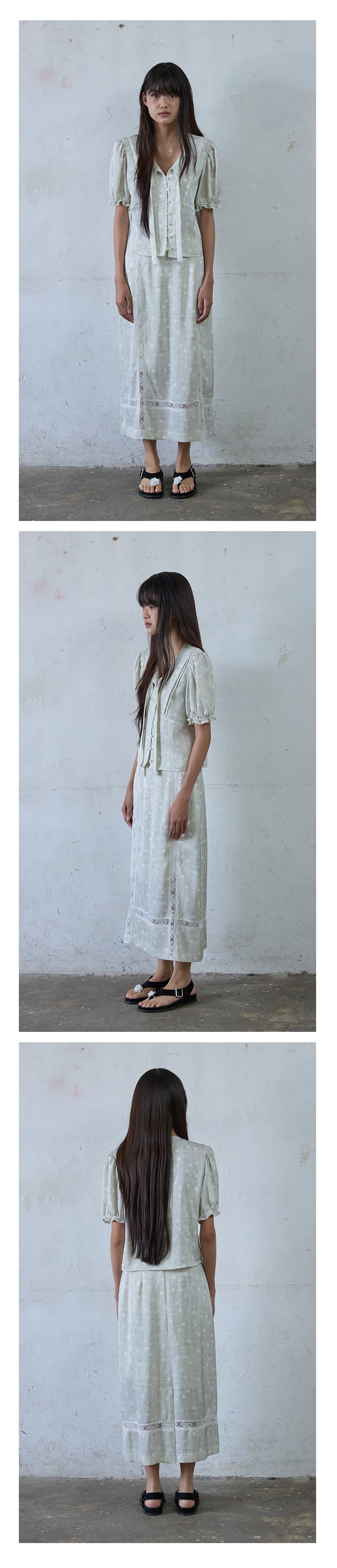 - 세로와 가로로 가로지르는 레이스 디테일이 고급스러우며 페미닌한 무드를 줍니다.