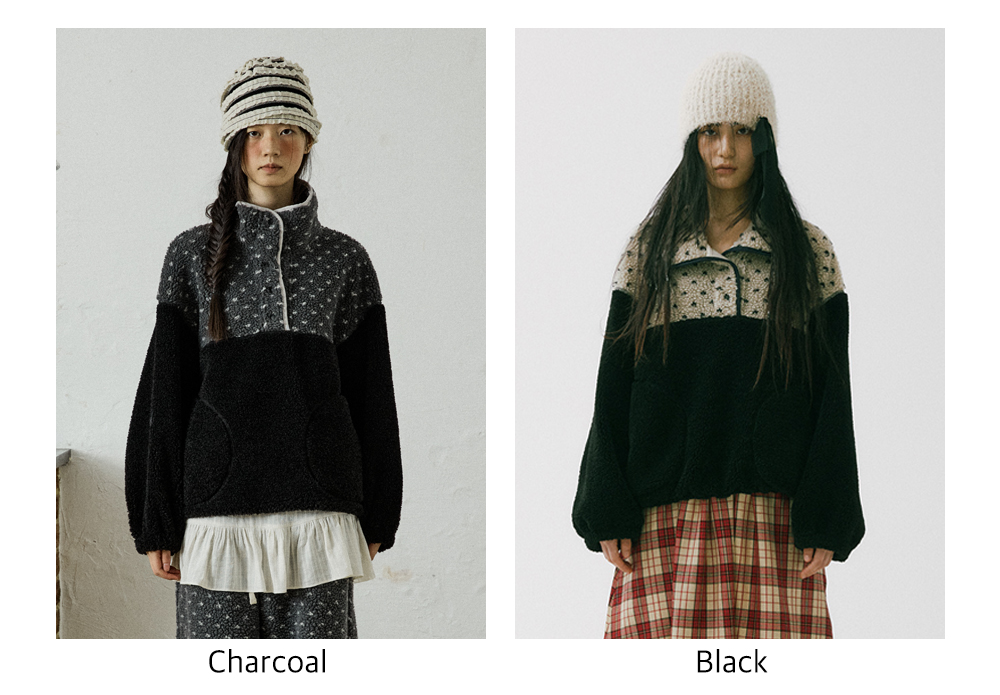 - 몽글한 텍스처의 플리스 소재로 포근한 착용감을 주며, 넥라인은 반집업 디자인으로 간편한 탈착이 가능합니다.