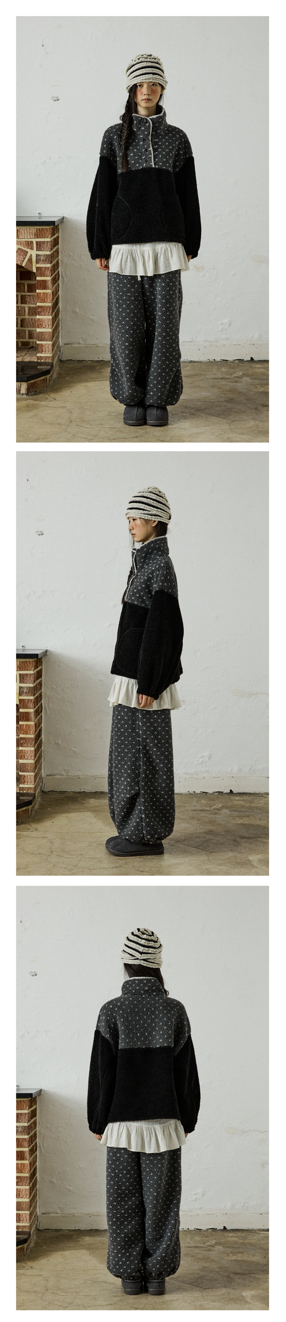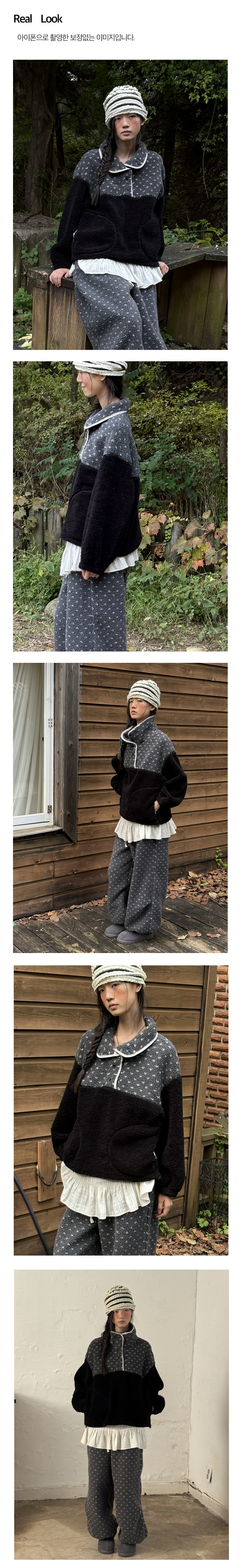 - 같은 원단의 하트 도트 플리스 팬츠와 함께 세트로 착용하면 더욱 귀엽고 포근한 겨울 셋업 스타일을 연출할 수 있습니다.