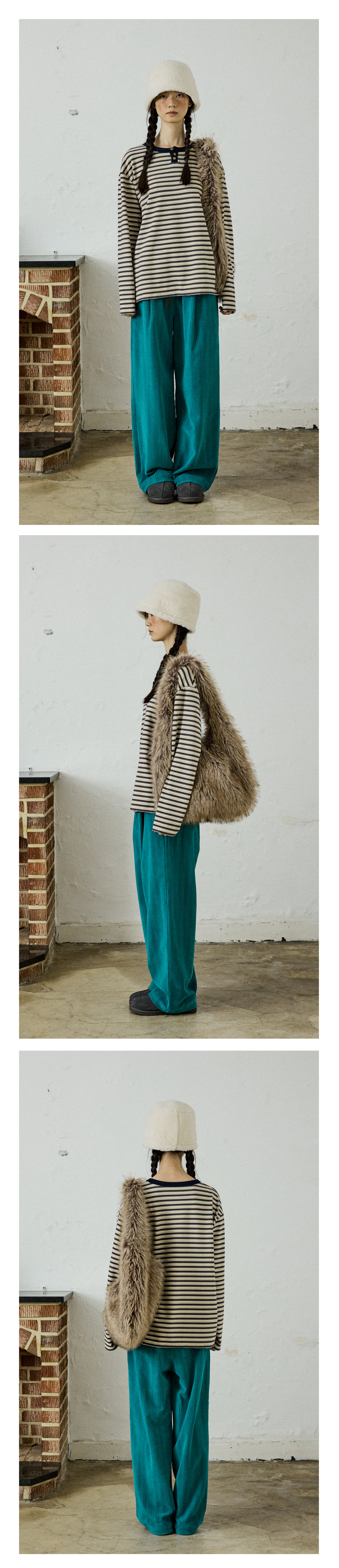 - 털 빠짐이 적은 고밀도 퍼 원단을 엄선해 보온감 있는 텍스처는 유지하면서도 깔끔한 착용감을 제공합니다.