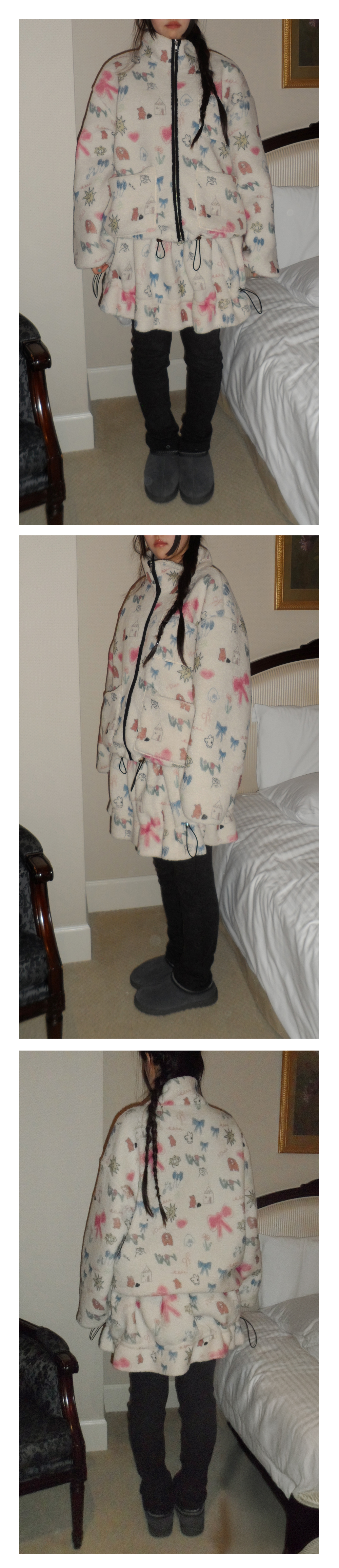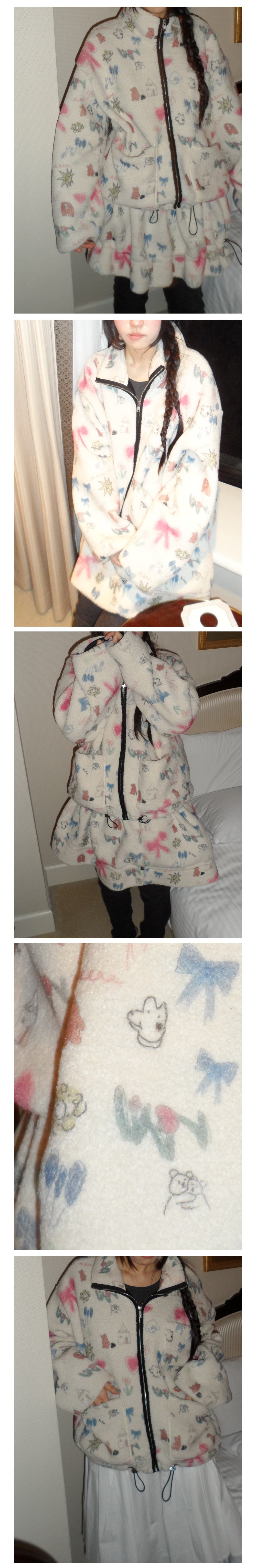 드로잉 패턴이 일정 간격으로 반복되는 원단 특성상 재단 과정에서 밑단 및 일부 구간의 패턴 위치가 상이할 수 있습니다.