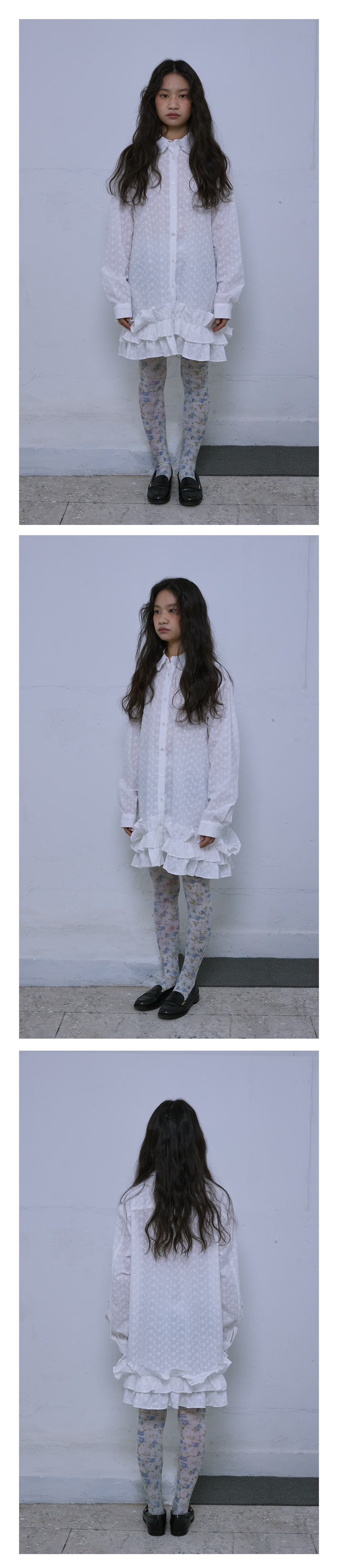 -밑단에 더해진 이중 프릴 디테일이 움직임에 따라 자연스럽게 퍼지며, 여유 있는 품과 기장으로 체형에 크게 구애 없이 편안한 실루엣을 완성해 줍니다.